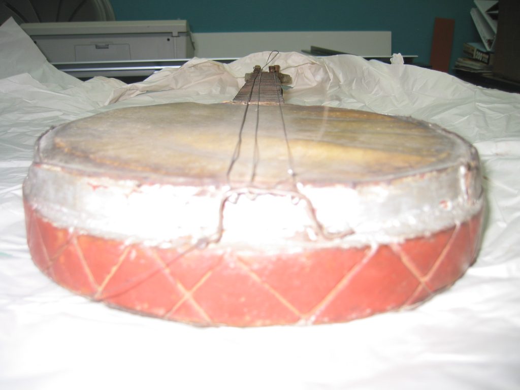 Next, we have an image of a banjo that seems to bridge the gap, between a banjo body made out of a gourd, and one that more resembles a wider circular drum.